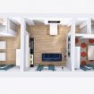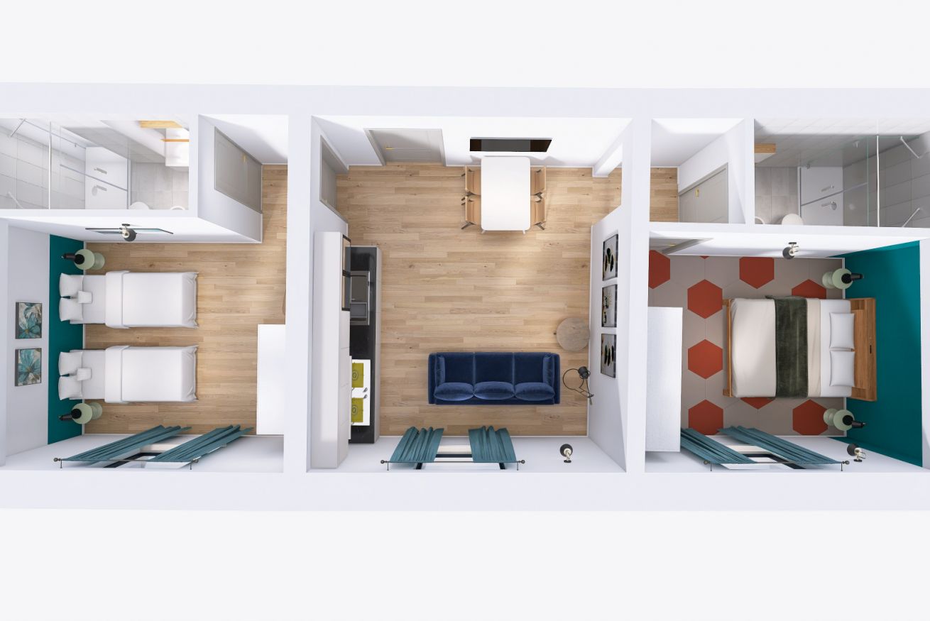 From the living room, you can access two large bedrooms. The style and petrol blue color are consistent with the rest of the structure. The master bedroom features a comfortable double bed and a spacious wardrobe with mirrored doors, while the other room is equipped with two single beds that can be joined together as needed. The two bathrooms showcase a modern and elegant style, complete with all sanitary fixtures and a spacious shower cabin located at the back of the room.
